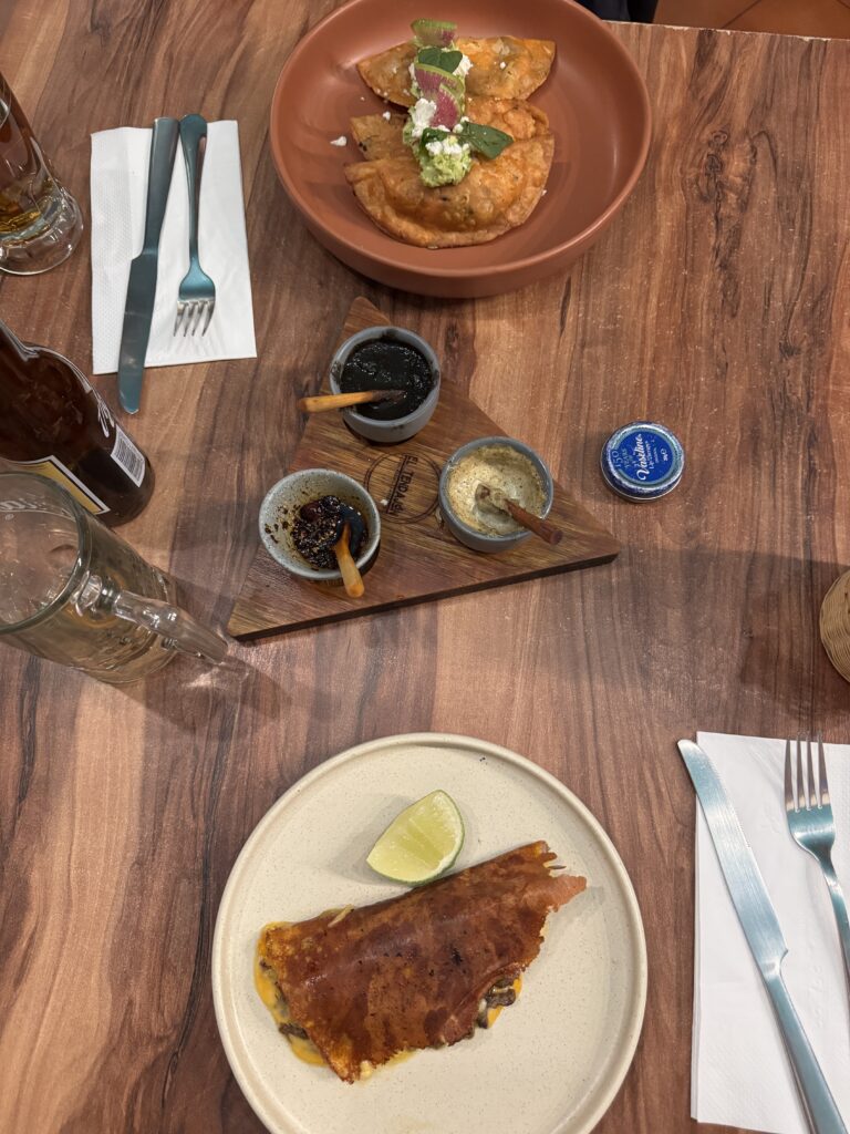 The restaurant is busy, clearly popular with tourists, which isn’t that surprising because the food is great. I order a skirt steak taco – rich with beef, cheese and creamy avocado, and grasshoppers. Thankfully, they’re invisible to the eye, but whatever they add, it works. My husband opts for a quesadilla trilogy: cheese and soft chorizo, cauliflower, squash blossom. Each one different, each one excellent. While we eat we excitedly discuss all of the places we want to visit and sip at our Victoria beer.